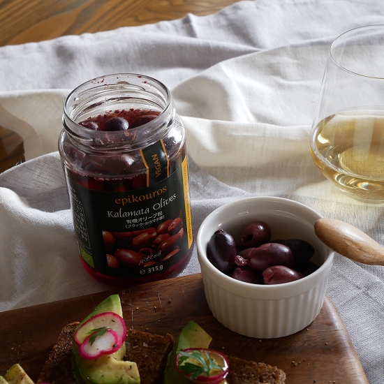 カラマタ産のオーガニックブラックオリーブ(種なし)。