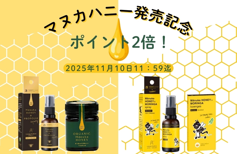 特に乾燥が厳しくなるこれからの季節、 自宅にカラダのお守りとして置いておきたい「マヌカハニー」商品。 発売を記念して、ポイント2倍キャンペーンを実施いたします! 是非、この機会にお試しください。 ■【キャンペーン該当商品】 [24organic days] ・オーガニックマヌカハニー 3種 ・マヌカ&プロポリススプレー ・マヌカ・ロゼンジ(プロポリス入り)MG250+ ・マヌカ&プロポリススプレーモリンガ ・マヌカ・ロゼンジモリンガ ■【キャンペーン期間】2025年10月20日(月)12:00~11月10日(月)11:59迄 ・・・・・・・・・ ニュージーランド北部の国立公園に隣接した山の上で養蜂を行う、オーガニック養蜂家で製造された「マヌカハニー」製品。 自社農園の10km範囲内やその周辺には道路や畑もなく、蜂たちは自社管轄のオーガニック農法のみを飛び交いマヌカの花粉と蜜を集めます。 マヌカハニーをはじめ、スプレーで使用しているマヌカフローラルウォーター、プロポリスも同じオーガニック養蜂家で製造・加工されています。 非加熱で製造されている為、マヌカハニーに含まれている酵素や様々な栄養素をそのまま摂ることができます。 ◎マヌカハニーとは? 先住民であるマオリ族の人々は「マヌカ」=「復活の木・癒しの木」と呼び、 葉や樹皮にも抗菌成分があることから、古くから薬草としても役立ててきました。 「マヌカ」は、ニュージーランドやオーストラリア原生のマヌカの花の蜜から作られる蜂蜜のこと。 1年のうち開花時期の12月~1月(南半球の夏)の4週間しか採蜜できません。 高い抗菌成分、抗菌力の強さが数値化されています。 ・・・マヌカハニー独自の抗菌・抗炎症成分「メチルグリオキサール」・・・ 「メチルグリオキサール」は、抗菌・抗炎症・抗酸化・免疫力向上・保湿など様々な力をもつ成分です。 マヌカハニー製品に表示されているMG=Methylglyoxal(メチルグリオキサール)の略。 数値=1㎏中の含有量(mg) 例:MG150+ ⇒ 150㎎以上含有