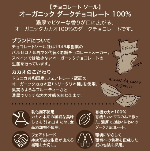 濃厚でビターな香りが口に広がる、カカオ100%のダークチョコレート。ドミニカ産のカカオ豆・トリニタリオ種を使用し、豊かな香りと酸味のバランスがとれた、カカオ本来の味わいを楽しめるチョコレートです。