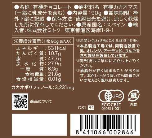 砂糖不使用でカカオマス100%のため、強い苦みがあります。少量をゆっくりお召し上がりください。