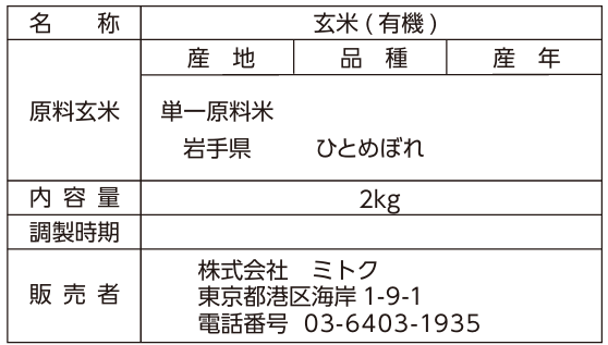 | 申込コード | 1325 | 原材料・素材等全成分 | 有機玄米(岩手県) |