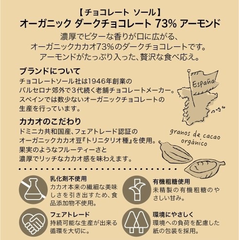 濃厚でビターな香りが口に広がる、カカオ73%のダークチョコレート。ドミニカ産のカカオ豆・トリニタリオ種を使用し、豊かな香りと酸味、たっぷりのアーモンドを楽しめるチョコレートです。