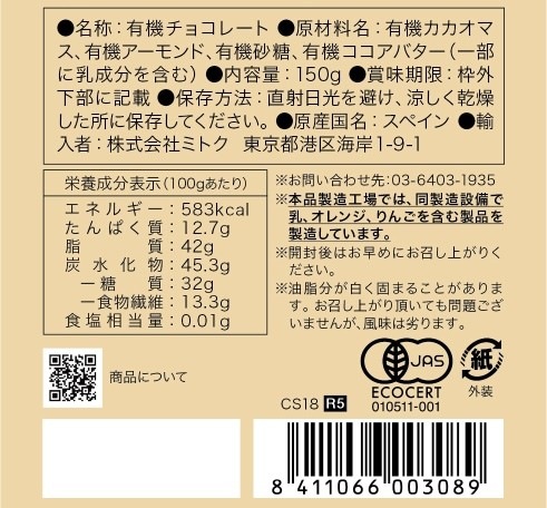 1枚あたり約35粒のオーガニックアーモンドを贅沢に使用、未精製の砂糖で甘さを加えています。