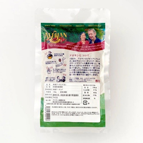 カリフォルニア州で穫れたオーガニックのアーモンド。ビタミンEや食物繊維が豊富なナッツです。ローストしていない、無塩タイプ。