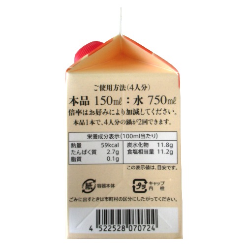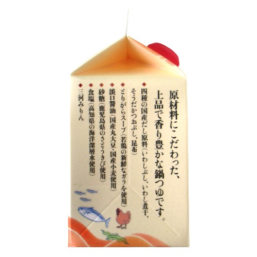 国産丸大豆と国産小麦を使用したうすくち醤油をベースに、 4種類の国産だし(いわしぶし、いわし煮干、そうだかつおぶし、昆布)と飼育方法にこだわった国産とりがらスープを使用した、 風味豊かな寄せ鍋つゆです。