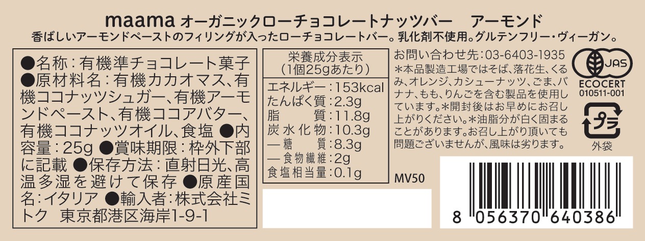 ローチョコレート ナッツバー アーモンド[マーマ]〈冬季限定〉 821(税込) -