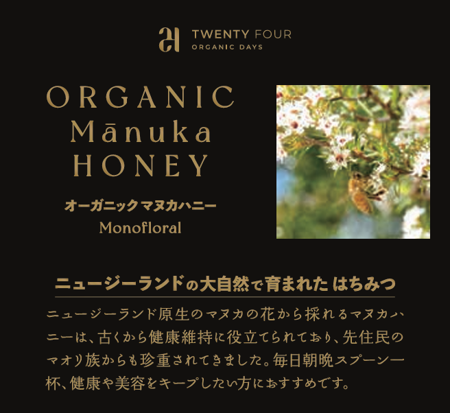家族の健康管理やインナーケアに。ニュージーランドのオーガニック養蜂家が採蜜しており、有機認証機関「アシュアクオリティー」のオーガニック規定に沿って製造されています。 養蜂場では農薬を一切使用しておらず、残留農薬も未検出の安心のマヌカハニーです。