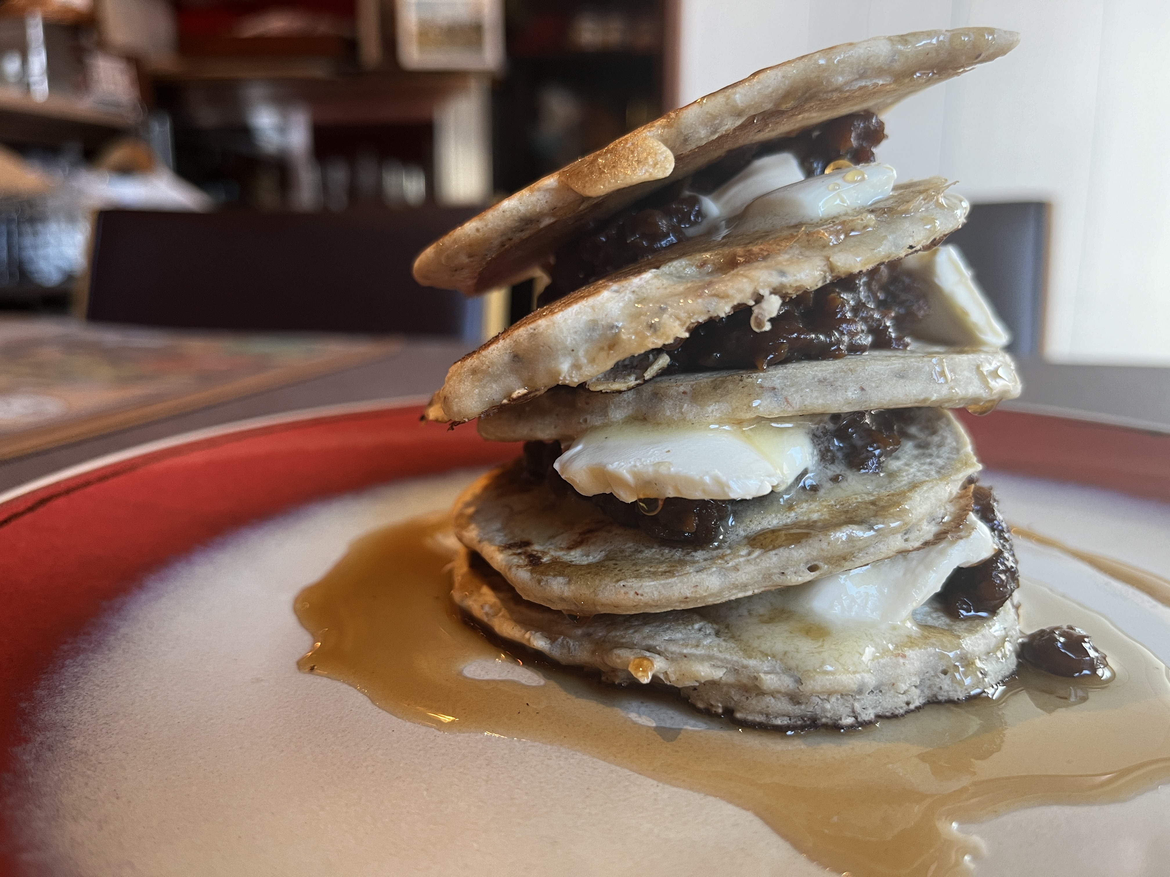 - あんことバターを重ねながら盛り付けて、メープルシロップをかけて完成