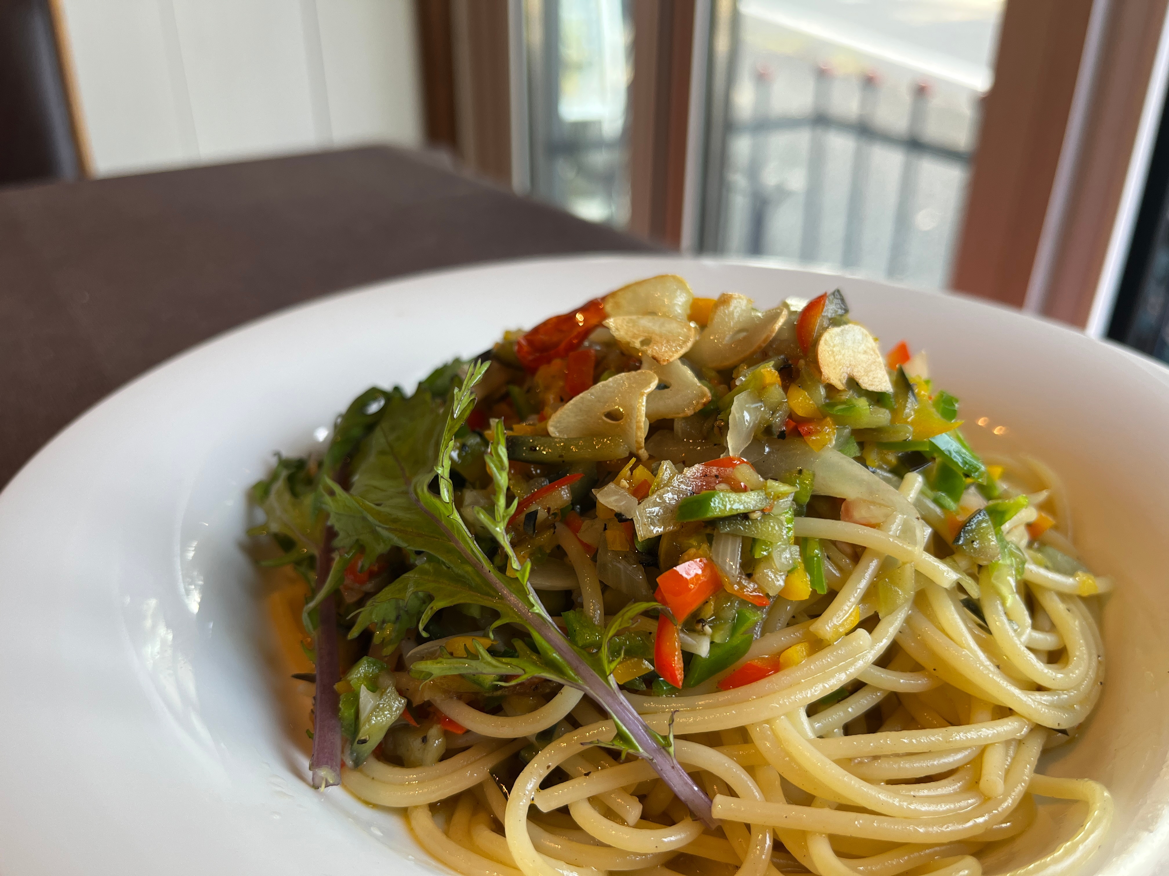 カラフル野菜のアーリオオーリオ もちもちのスパゲッティがにんにくと絡んで美味しい! 野菜を刻んで小さくしてあるので 野菜が苦手なお子様にもおすすめ! にんにくの旨味で野菜が大好きに 材料(1~2人前) <フェリチェッティ>スパゲッティ 100g 水 1 リットル 塩 小さじ2(10g) <ボルドーニ>エクストラバージンオリーブオリーブオイル 大さじ2 にんにく 1 片 鷹の爪 1 本 玉葱 30g (1/4目安) ナス 30g (1/3目安) 赤ピーマン 1/2 黄ピーマン 1/2 ピーマン 1/2 *スパゲッティの茹で汁(仕上げ用) 大さじ3 塩、黒こしょう 適量 作り方 (下準備) 玉葱、ナス、各ピーマンを、粗いみじん切りに、にんにくは薄くスライスする 鷹の爪はヘタを取り種を抜いておく 大きめの鍋にお湯を沸かし、塩を入れ袋に記載の指定時間でスパゲティを茹で始める。 フライパンに分量のオリーブオイルを入れ、にんにくを入れる。きつね色になるまで弱火で炒めたら取り出して火をとめ、鷹の爪を入れ、焦げる手前でとりだす。(鷹の爪は予熱で!) 玉葱、なす、ピーマンを入れて炒め、塩とこしょうをふる。 スパゲッティの茹で汁を加えて、火をとめる(*)フライパンをよく振りながら混ぜて、油分と水分をしっかり乳化させる。 茹で上がったスパゲティをザルにあけ、フライパンのソースとあわせる。 お皿に盛り付け、パセリなどを散らしてできあがり。(写真では水菜を散らしています) ポイント アーリオーリオ(オイルスパゲッティ)のおいしさの秘密は、 「スパゲッティとソースを和えるときには、火をかけない」のがポイントです! 今回のレシピで使用した食材 <フェリチェッティ>スパゲッティ <ボルドーニ>エキストラバージンオリーオリーブオイル レシピ一覧ページへ戻る レシピ監修:かとうみおさん(元ミトクスタッフ) 2bananeira. (ドイスバナネイラ)・六弥苑(ロクヤヲン)/オーナー @バナネイラ 2bananeira.(横浜・藤が丘)無農薬・無化学肥料の露地野菜を中心に、プラントベース(植物性100%)の料理を提供する飲食店と、六弥苑(西伊豆・松崎町)都会と田舎暮らしの架け橋となる、ダーチャ型ゲストハウス・イベントスペースを運営。 環境改善や農を含めた、恒久的で持続可能なくらしを創造する「新しい生き方のデザイン」を構築中。 https://2bananeira.com https://rokuyawon.com
